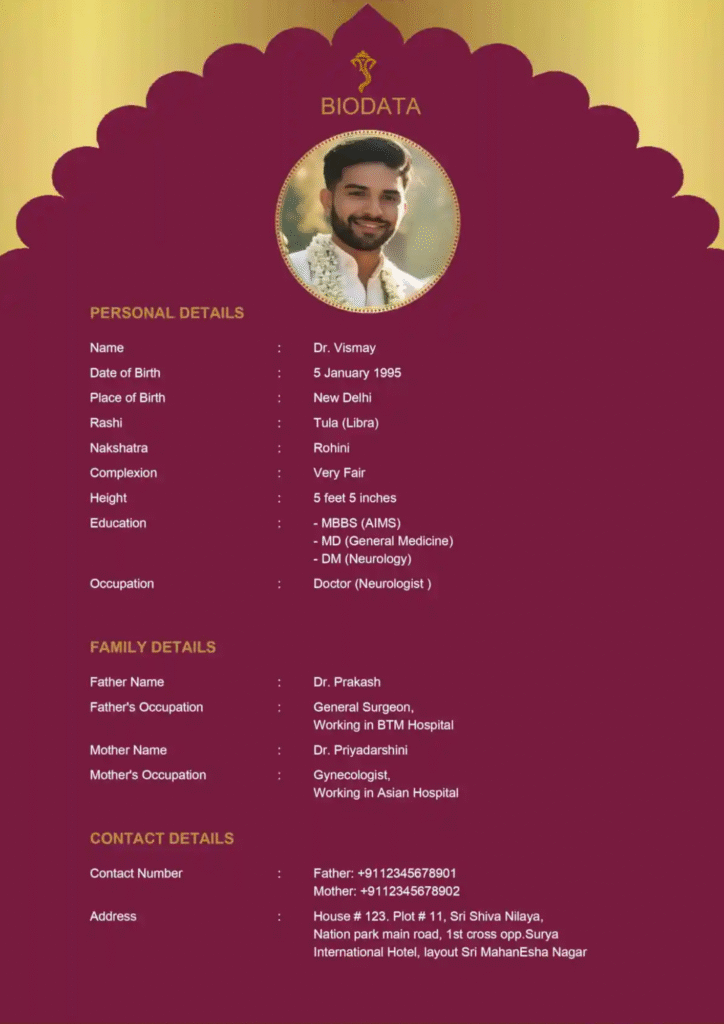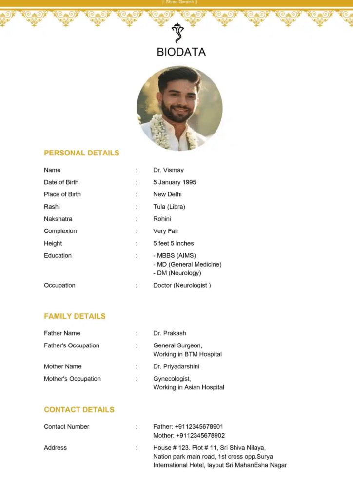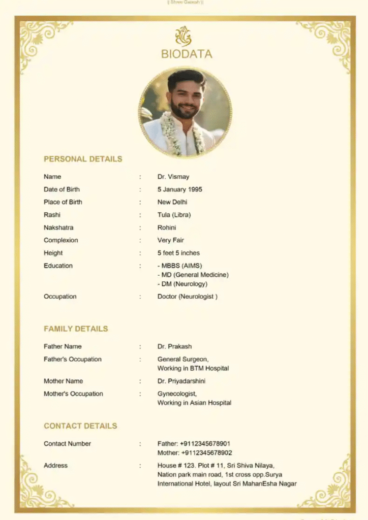 A well-designed Marriage Biodata is every man’s first impression when it comes to arranged marriage discussions. Whether it’s shared with a family, on a matrimonial site, or sent on WhatsApp – your biodata represents you: your background, career, personality, and values.